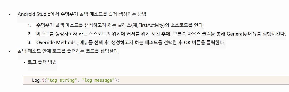 ㄴ> 콜백 메소드 안에 로그를 출력하는 코드를 삽입하여 액티비티 생명주기를 LogCat을 통해 직접 확인할 수 있다.