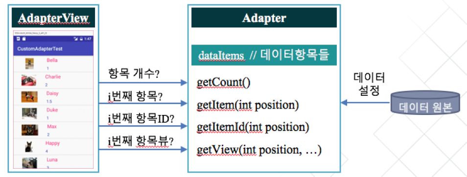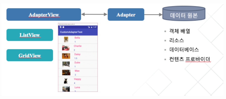 : 데이터를 관리하며 데이터 원본과 어댑터 뷰(ListView, GridView) 사이의 중계 역할