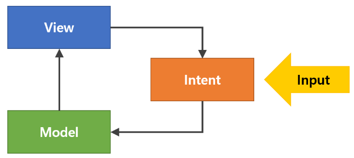 3. Model은 Intent로부터 동작을 가져옴 (MVI의 Model은 단순 데이터 뿐만 아닌 Application 상태 (State)의 Business Logic을 관리함)