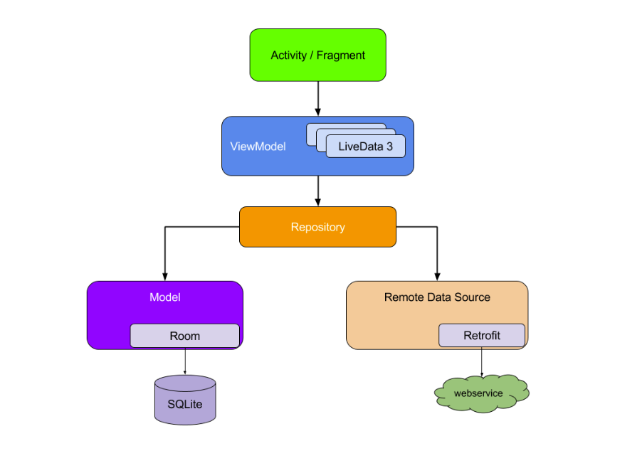 해당 그림은 안드로이드에서 권장하는 아키텍처이다. 다이어그램의 순서를 살펴보면 아키텍처의 Activity / Fragment 와 같은 UI 레이어에서 직접 Data 에 접근하지 않고 Repository 를 통하여 데이터를 가져오는 것을 확인할 수 있다.